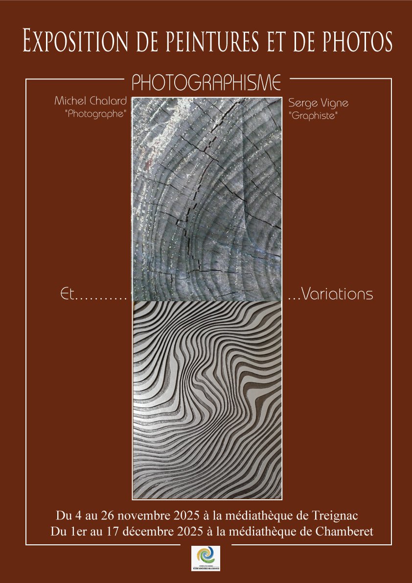 Venez découvrir l’exposition de peintures et photos de Messieurs Michel Chalard (Photographe) et Serge Vigne (Graphiste) à la médiathèque de Treignac du 4 au 26 novembre et à la médiathèque de Chamberet du 1er au 17 décembre.