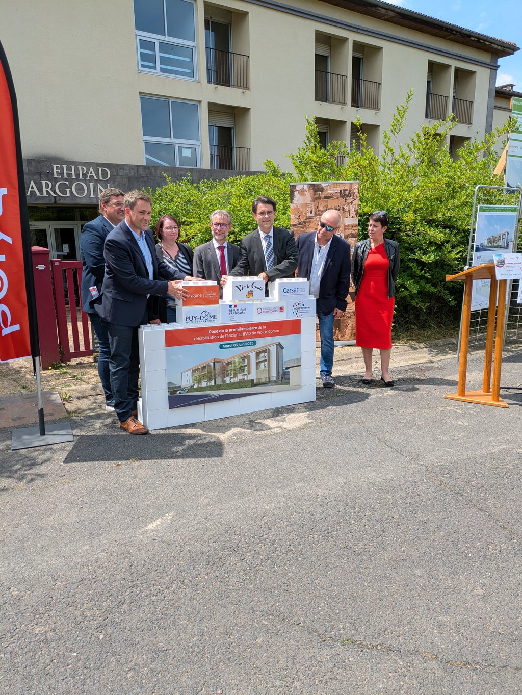 Pour l’occasion, M. le Maire, Antoine DESFORGES était accompagné des principaux financeurs et partenaires de l’opération : le Secrétaire général de la Préfecture du Puy-de-Dôme, M. Jean-Paul VICAT, le Vice-Président du Conseil Départemental en charge des personnes âgées, M. Fabien BESSEYRE, accompagné par Mme Jeanne ESPINASSE, Conseillère Départementale, le Président de Mond’Arverne Communauté, M. Pascal PIGOT, la Présidente de la CARSAT Auvergne, Mme Virginie GACHON, le Directeur Général de POLYGONE SA, M. Aurélien TISSIER, et l’Architecte maître d’œuvre, M. Philippe THUILIER.