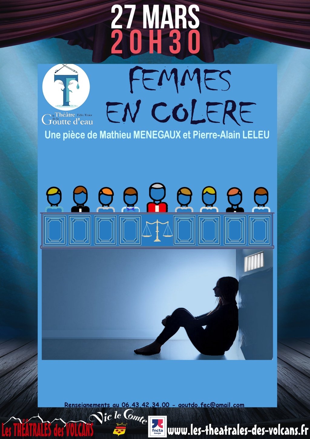 Dans le cadre du festival Les théâtrales des volcans, venez profiter du spectacle Femmes en colère : Cette pièce est adaptée du roman éponyme de Mathieu Menegaux. Elle met en scène les délibérations d'un jury d'assises à l'issue d'un procès : Trois magistrats et six jurés tirés au sort vont devoir choisir entre punition et pardon pour une femme qui a avoué son crime mais qui se dit victime et réclame justice. La sentence résultera de l'approche juridique des magistrats confrontée aux réactions émotionnelles et contrastées des jurés populaires. Nous n'assistons pas au procès. Seules quatre phrases entendues voix off au début de la pièce résument le réquisitoire de l'avocat général. Les circonstances qui ont conduit Mathilde Collignon devant la cour d'assises, nous sont décrites par l'accusée elle-même, isolée dans une cellule du palais de justice en attendant le verdict. Son récit, sa colère, ses angoisses sont intimement mêlées aux discussions enflammées, parfois violentes, des membres du jury.