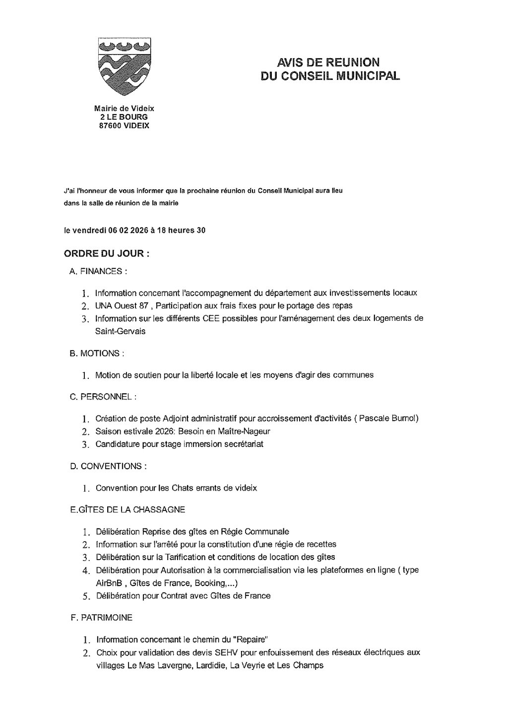 Le prochain conseil municipal de VIDEIX se déroulera le vendredi 6 février 2026 à 18H30 à la mairie de Videix