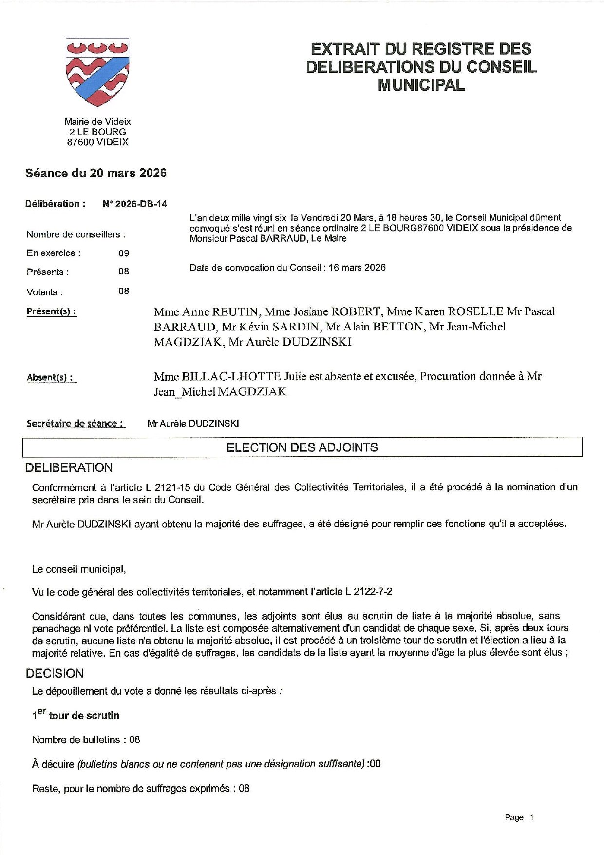 la délibération 2026-DB-14 concernant l'élection des Adjoints :