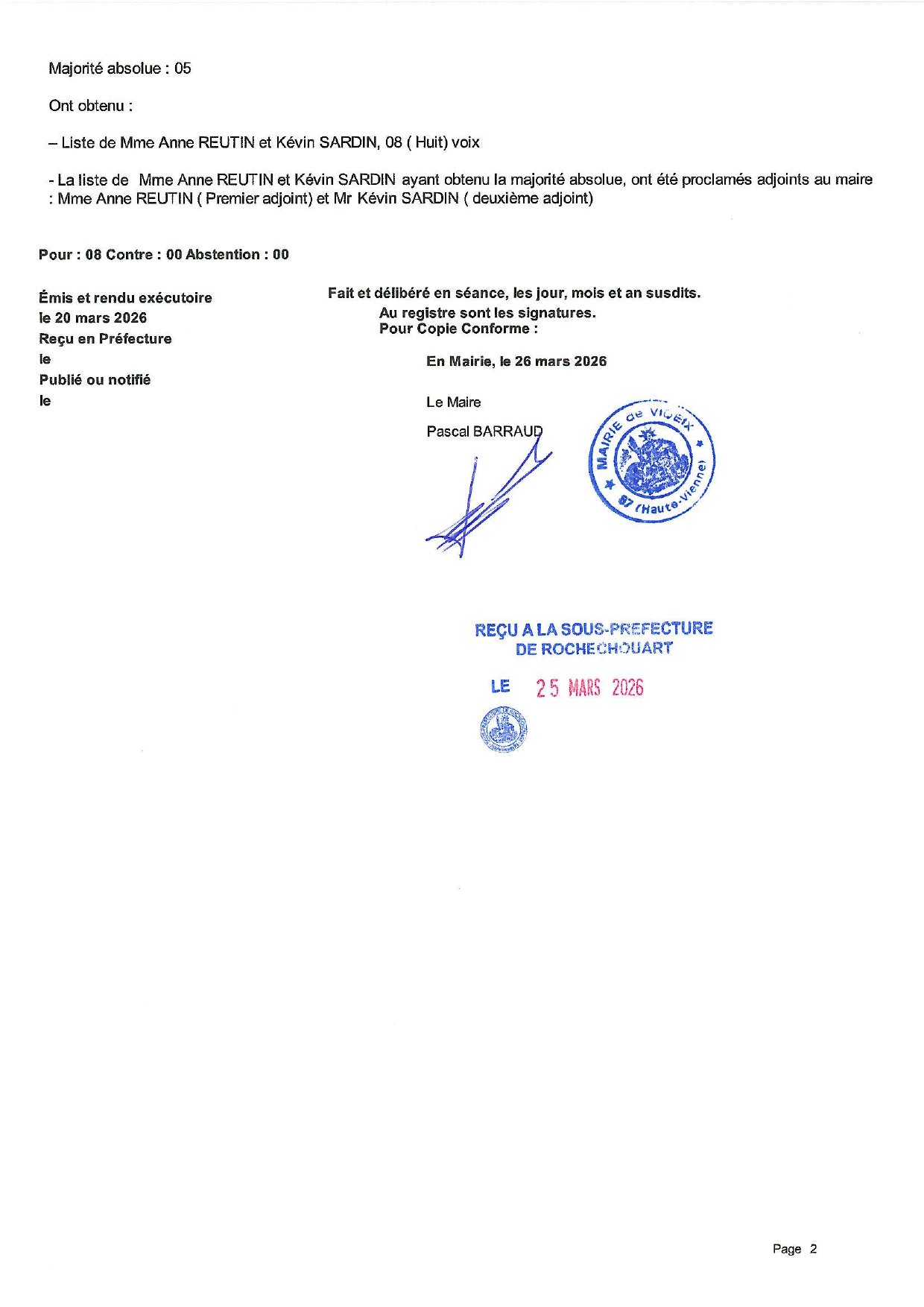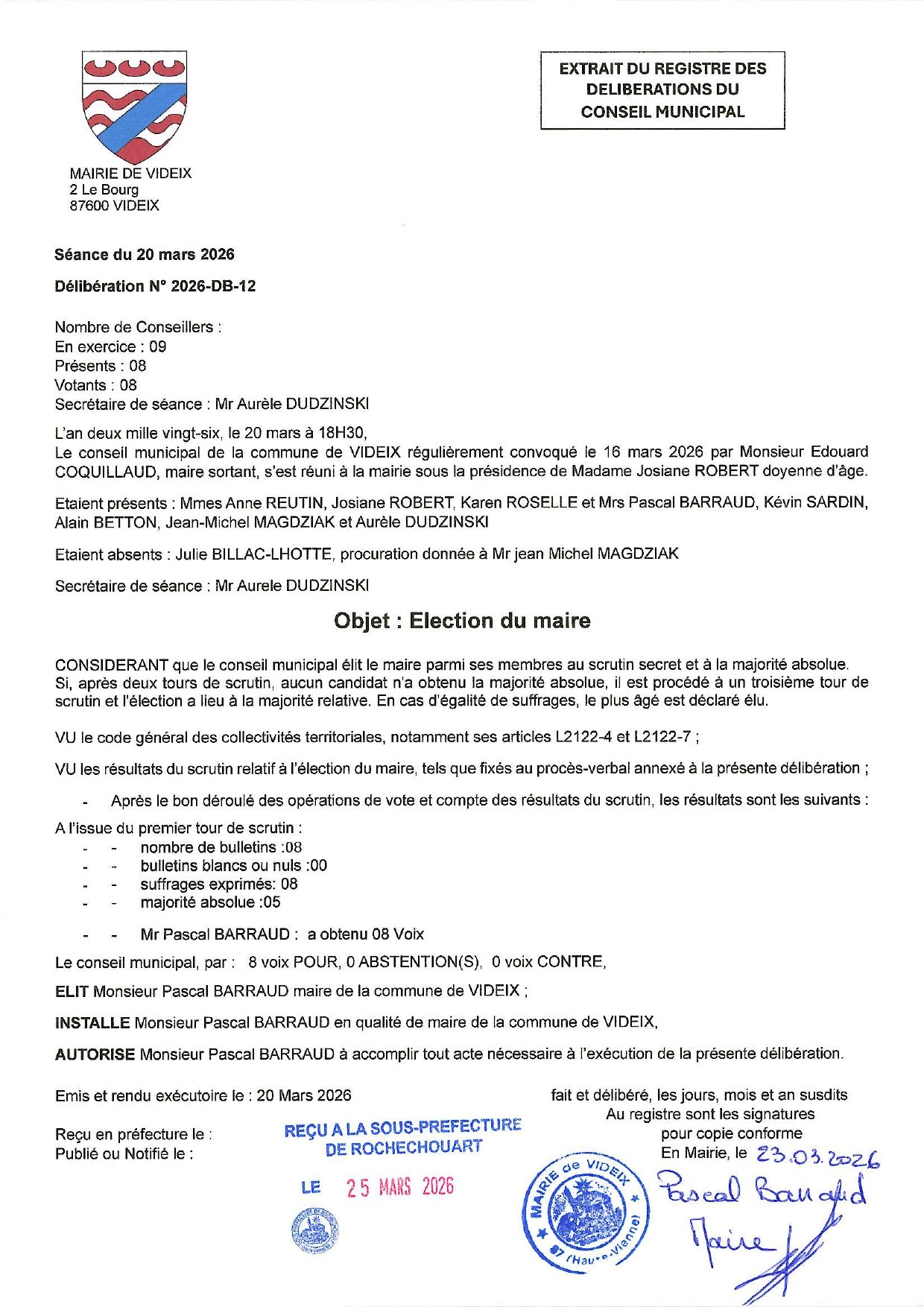 la délibération 2026-DB-12 concernant l'élection du Maire de Videix, Mr Pascal BARRAUD