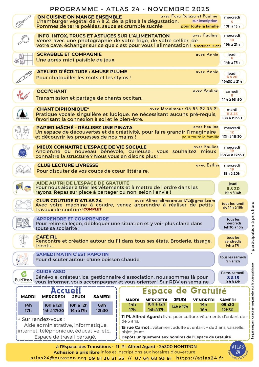 En novembre à ATLAS 24 retrouvez vos ateliers hebdomadaire, mais également :