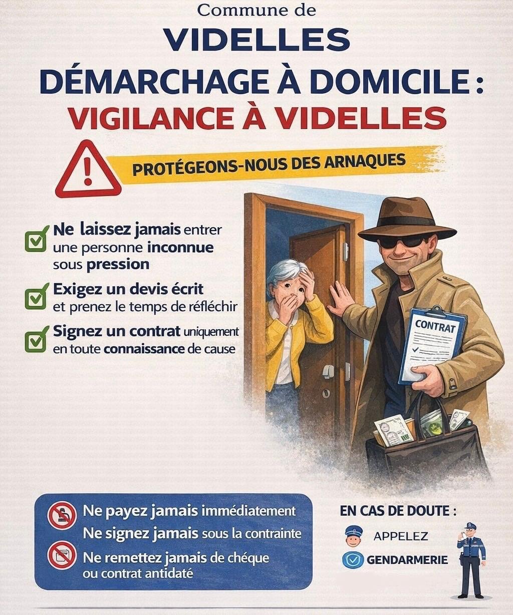 La commune de Videlles souhaite attirer l’attention de ses habitants sur les pratiques de démarchage à domicile, parfois abusives, qui peuvent concerner des travaux, des services ou des équipements présentés comme particulièrement avantageux.