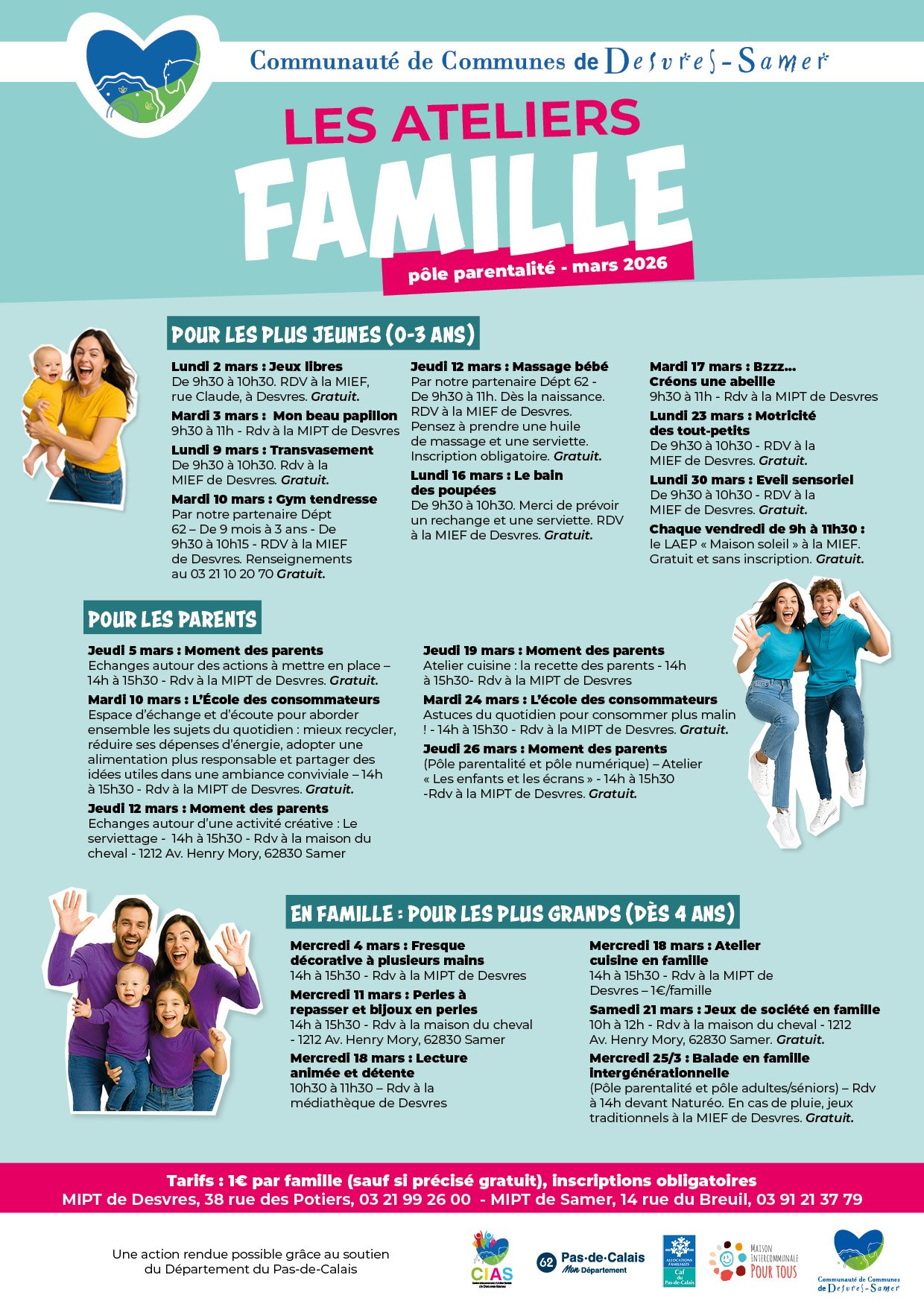 En mars 2026, la Communauté de Communes de Desvres-Samer propose une nouvelle programmation des Ateliers Famille, organisée par le pôle parentalité. Tout au long du mois, de nombreux rendez-vous gratuits ou à tarif symbolique sont proposés aux familles du territoire, pour se retrouver, échanger, apprendre et partager des moments de complicité.