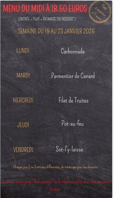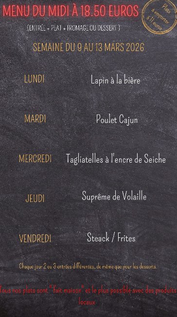 Ouvert le midiAvec formule plat du jour à 18 euros 50Du lundi au vendredi