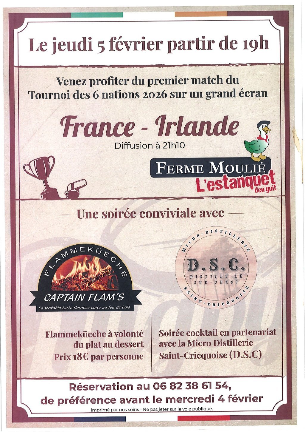 Venez profiter du premier match du tournoi des 6 nations 2026 sur un grand écran : France -Irlande.