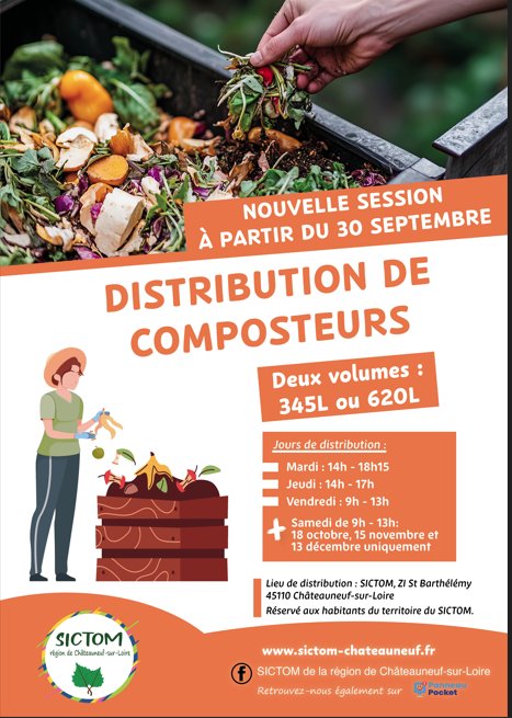 La distribution de composteurs reprend au SICTOM de la région de Châteauneuf-sur-Loire dès le Mardi 30 septembre 🎉 Et c’est gratuit !