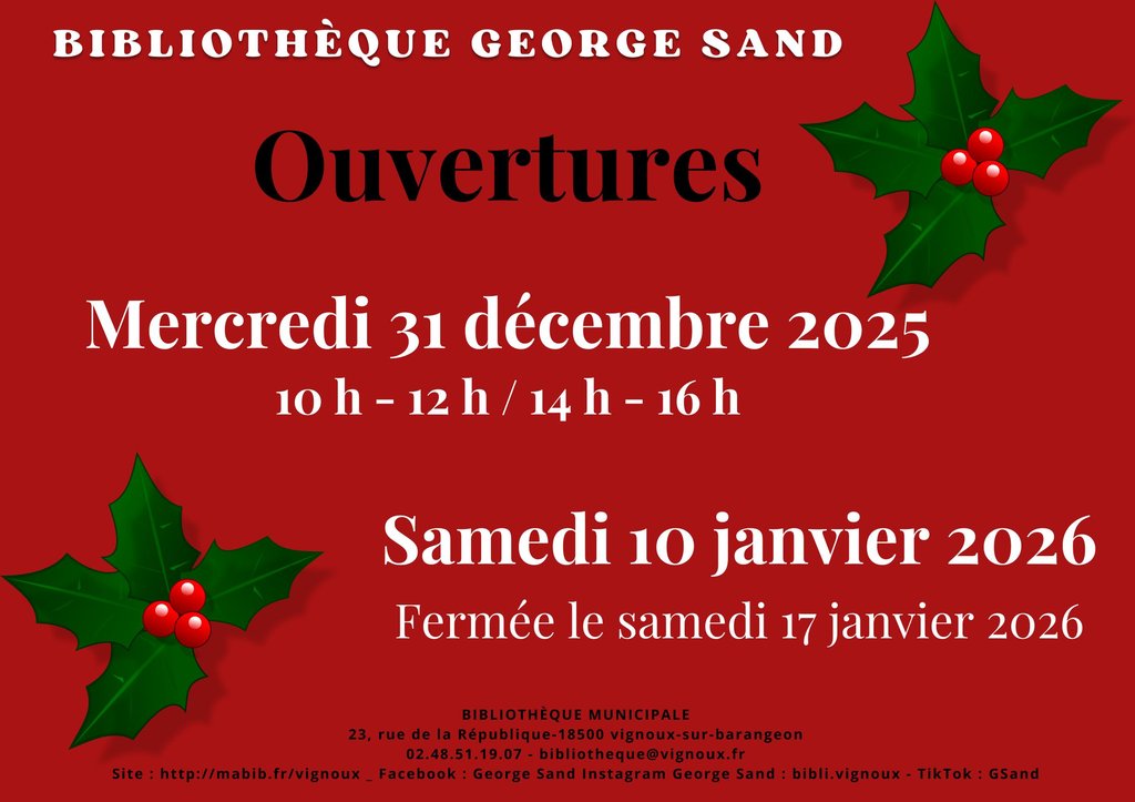 A l'occasion des fêtes de fin d'année, votre bibliothèque George Sand sera fermée la semaine de Noël.