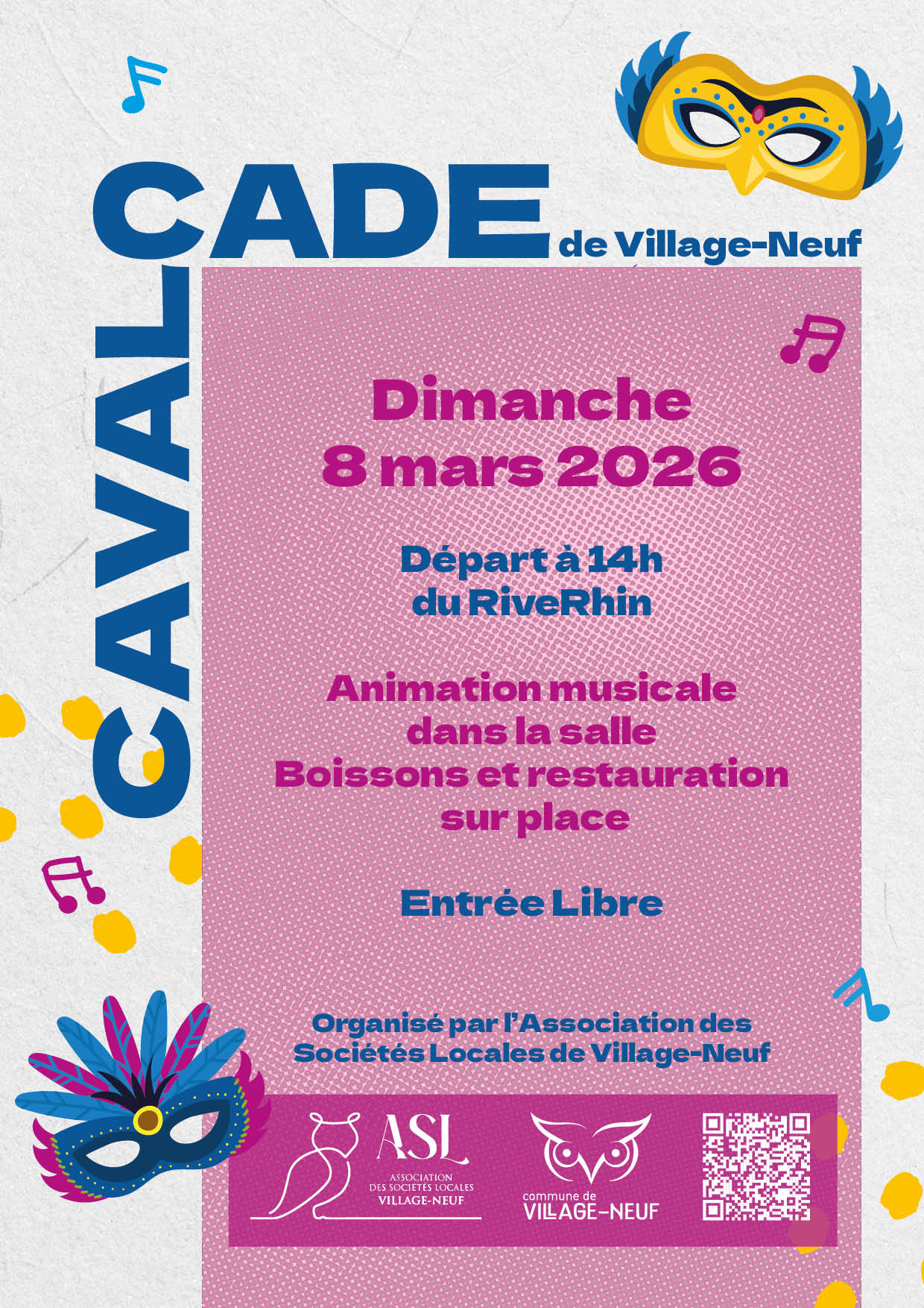 Le dimanche 8 mars 2026, Village-Neuf se transformera en haut lieu de la fête avec la très attendue Cavalcade, orchestrée par l’Association des Sociétés Locales (ASL). Ce rendez-vous carnavalesque, inscrit dans la tradition locale, rassemblera chars, musiciens et carnavaliers pour un défilé haut en couleur. Le départ de cette grande cavalcade sera donné à 14 h depuis le RiveRhin. Costumes flamboyants, confettis et rythmes festifs animeront chaque recoin du parcours