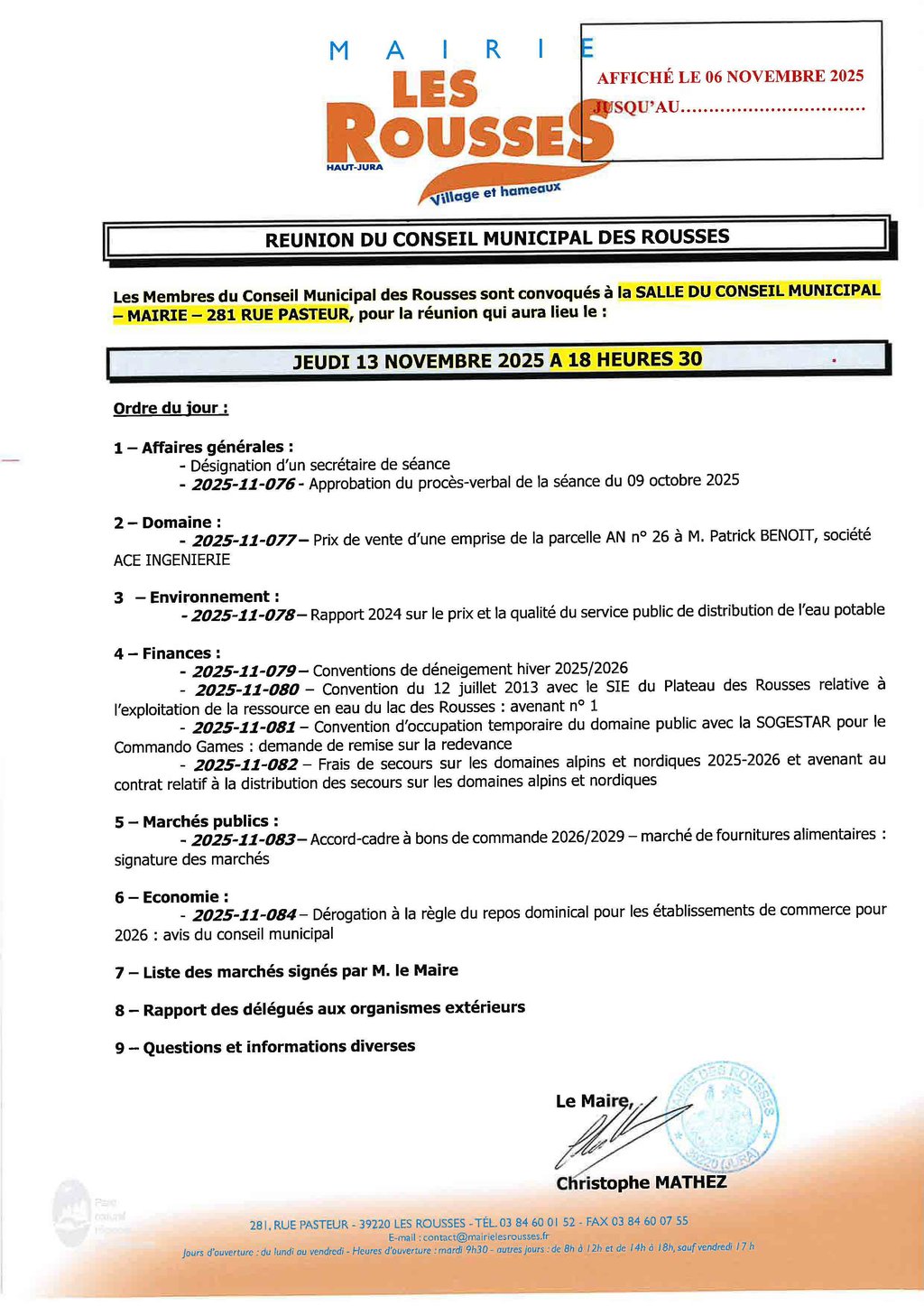 Le conseil municipal se réunira le jeudi 13 novembre à 18h30.