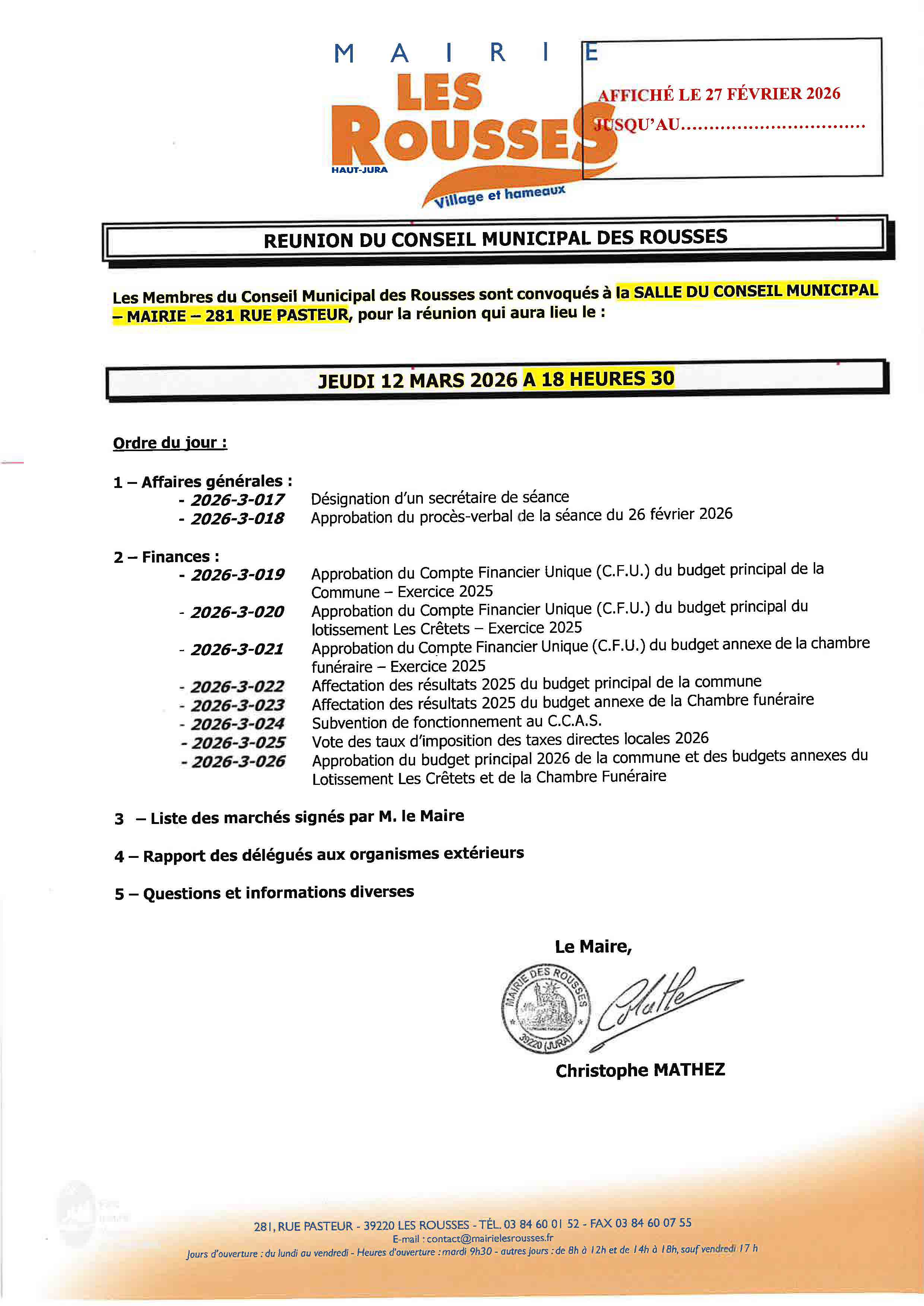 Le conseil municipal se réunira le jeudi 12 mars à 18h30.