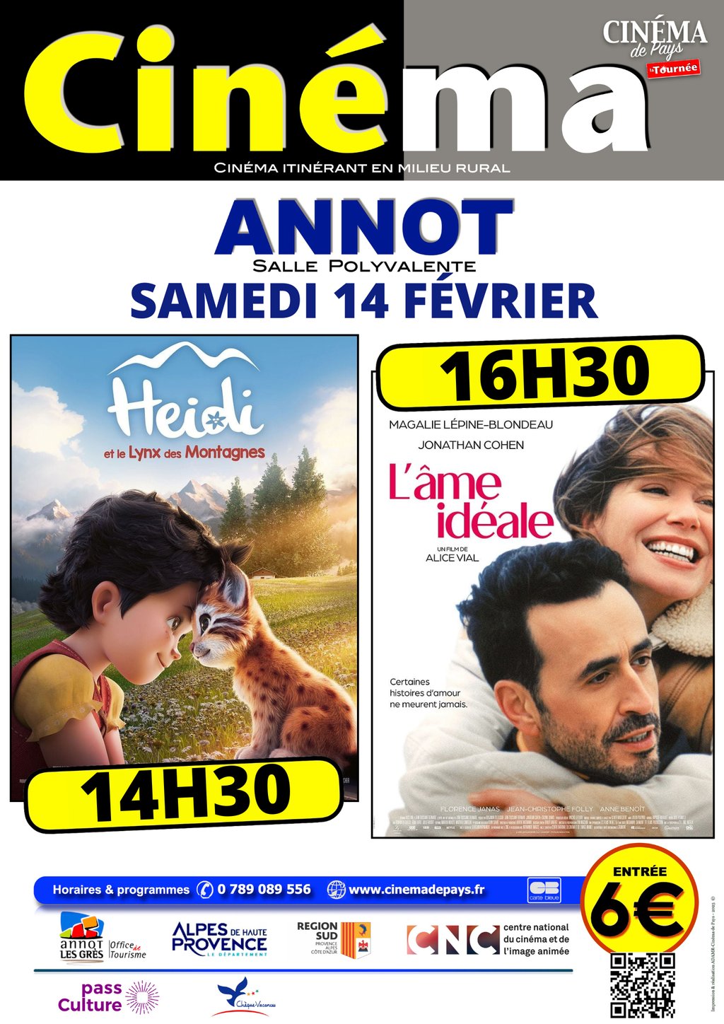 Le Cinéma de Pays et la Mairie d'Annot vous proposent 2 séances : à 14h30  Heidi et le lynx des montagnes et à 16h30  L’âme Idéale
