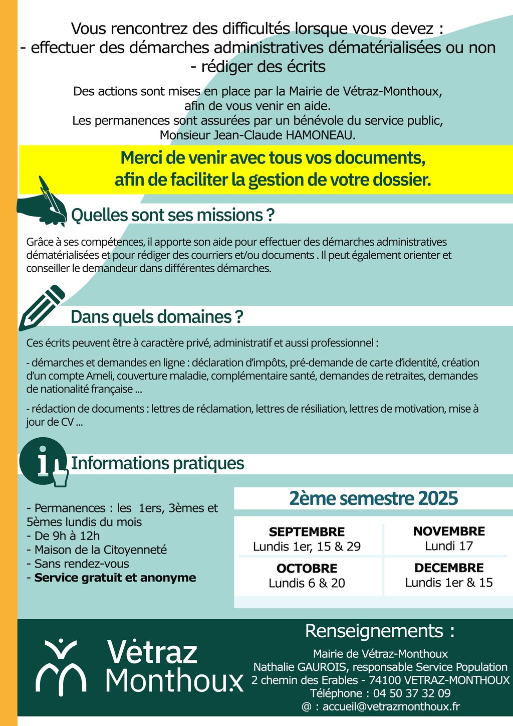 Il propose ses compétences bénévolement pour vous aider (exemples : création de compte Ameli, demande de l’aide à la complémentaire santé (ACS), dossier retraite, demande de nationalité française, rédaction de courriers aux organismes, etc.).