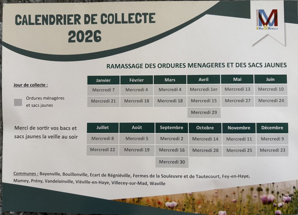 Vous trouverez ci-joint le calendrier de collecte pour 2026.