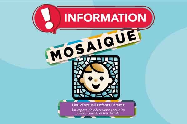 Mosaïque, le lieu d’accueil enfants-parents sera fermé du 20 décembre au 4 janvier, pour les congés d'hiver. Réouverture le lundi 05 janvier à la médiathèque de Villecomtal-sur-Arros.