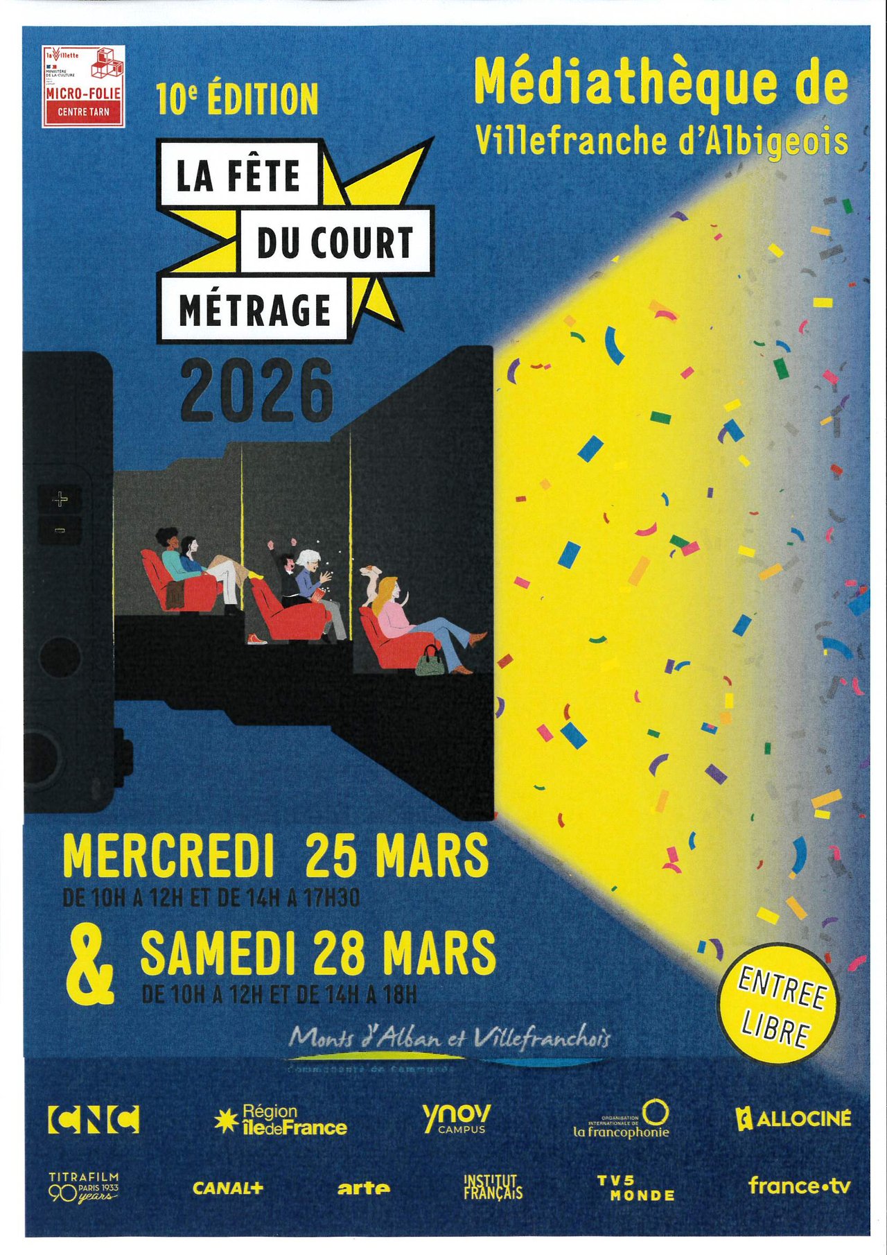 À l’occasion de la Fête du court métrage 2026, la Micro-Folie Centre Tarn s’associe à cet événement national et propose plusieurs séances cinéma à la médiathèque de Villefranche d’Albigeois, les 25 et 28 mars 2026, de 10h à 12h30 et de 13h30 à 18h.