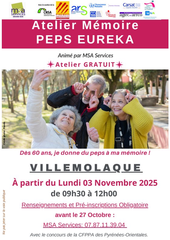 Dans le cadre de la mise en place d'action de prévention sénior financés par la CFPPA 66, MSA SERVICES GRAND SUD, propose une action gratuite sur la thématique de la MEMOIRE intitulé " MEMOIRE PEP'S EUREKA" à destination de vos séniors de 60 ans et +.