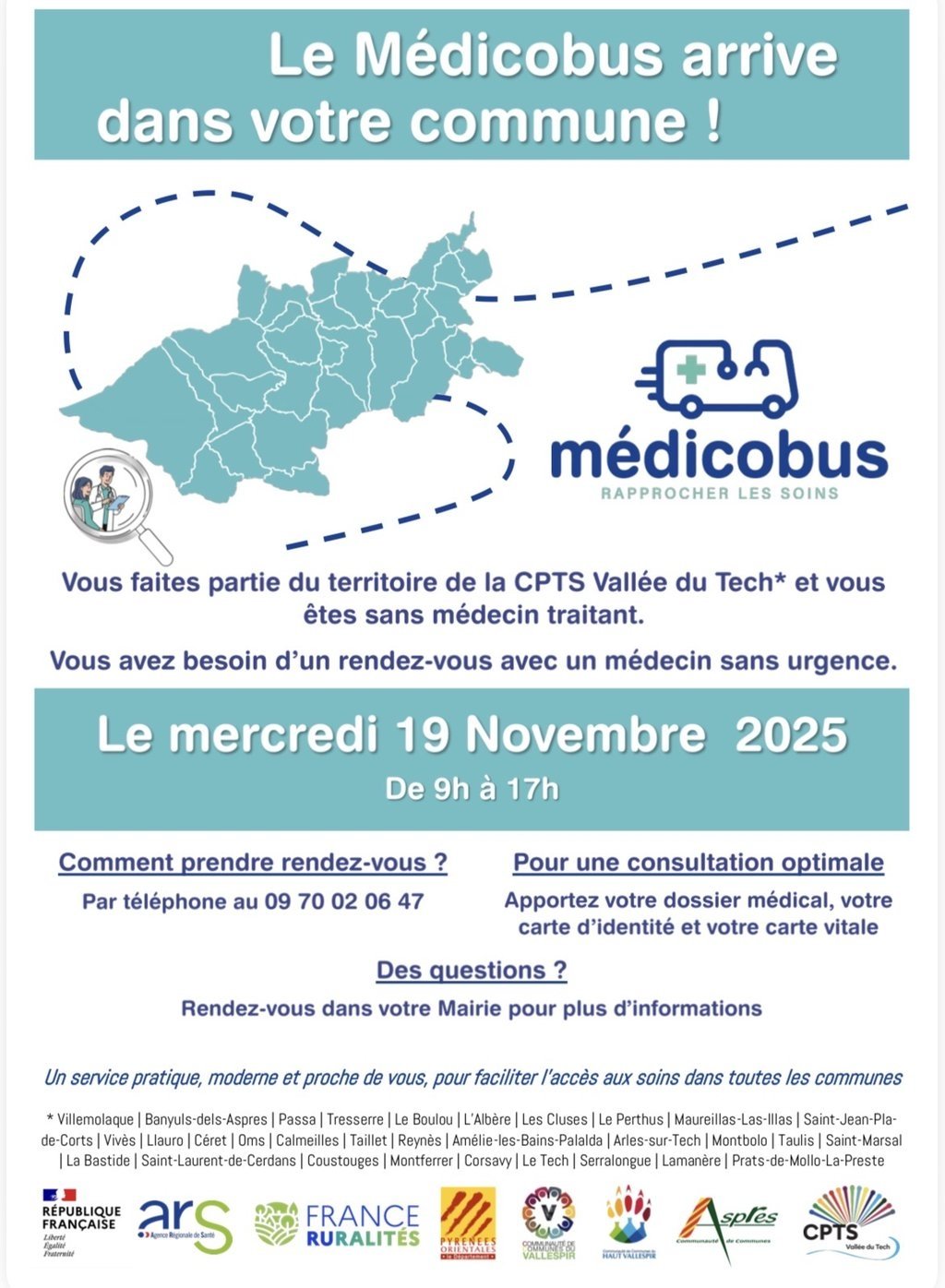 Le Medicobus sera stationné sur le parking du plateau sportif. Les toilettes de la salle Canigou seront mises à disposition ainsi que l’entrée de la salle Canigou qui servira de salle d’attente en cas de mauvais temps.