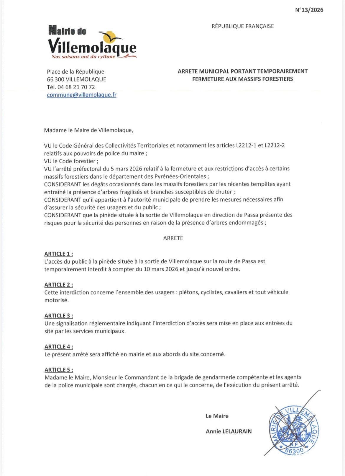 L’accès à la pinède, route de Passa, est toujours interdit d’accès au public, de nombreux pins menacent encore de tomber après la tempête du mois de février. L’accès aux massifs forestiers, qui avait été limité suite à la tempête par arrêté préfectoral, ayant été levé ce matin, un arrêté municipal a été rendu ce jour, considérant que le site est toujours dangereux tant que la zone n’a pas été nettoyée.