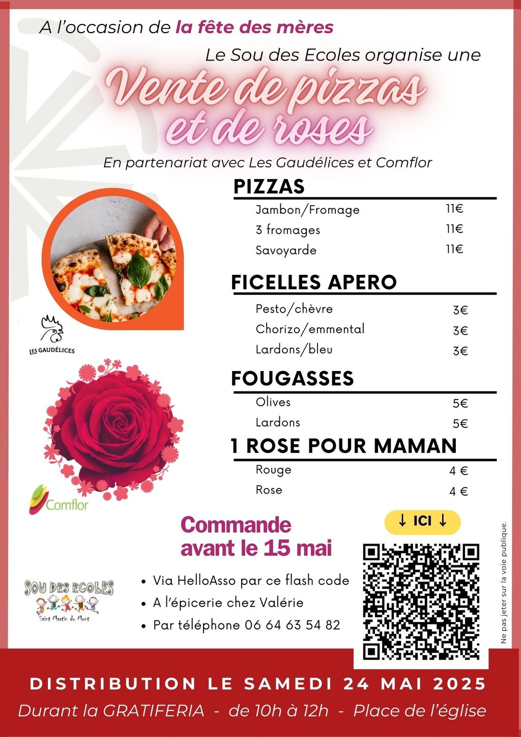 Venez chercher vos fougasses, ficelles apéritives, pizzas sur la place du marché lors de la gratiféria le 24 mai 2025 entre 10h et 12h. Cette année, nous vous proposons également l’opportunité de commander une rose car dimanche 25 mai, c'est la fête des mamans.