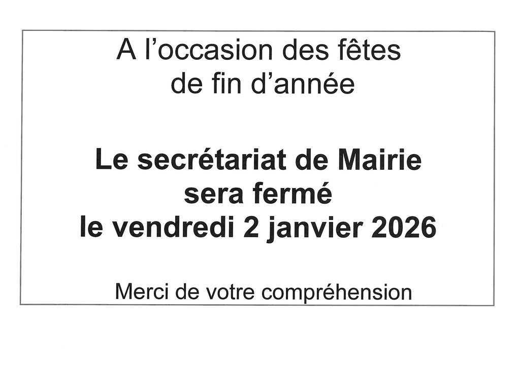 Le secrétariat de Mairie sera fermé le vendredi 2 janvier 2026.