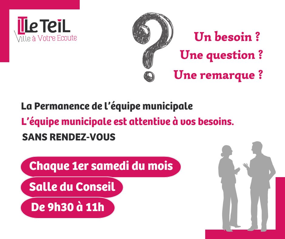 Vos élus organisent ces "Permanences de l'équipe municipale" tous les 1ers samedis du mois de 9h30 à 11h à l'Hôtel de ville, Salle du Conseil.