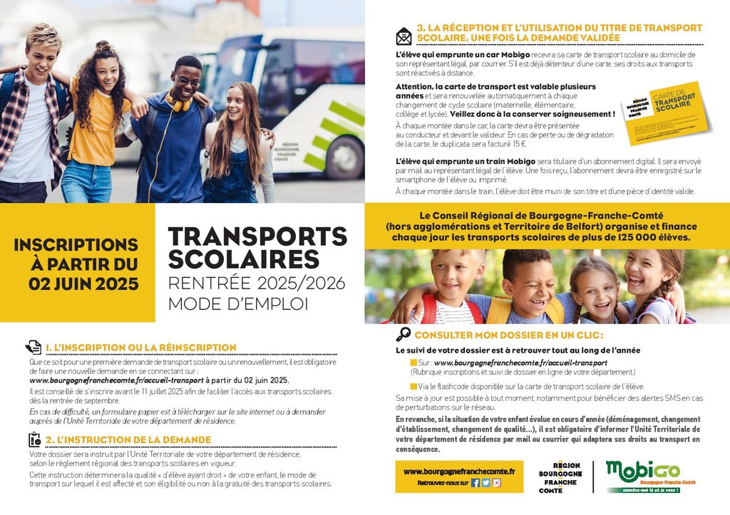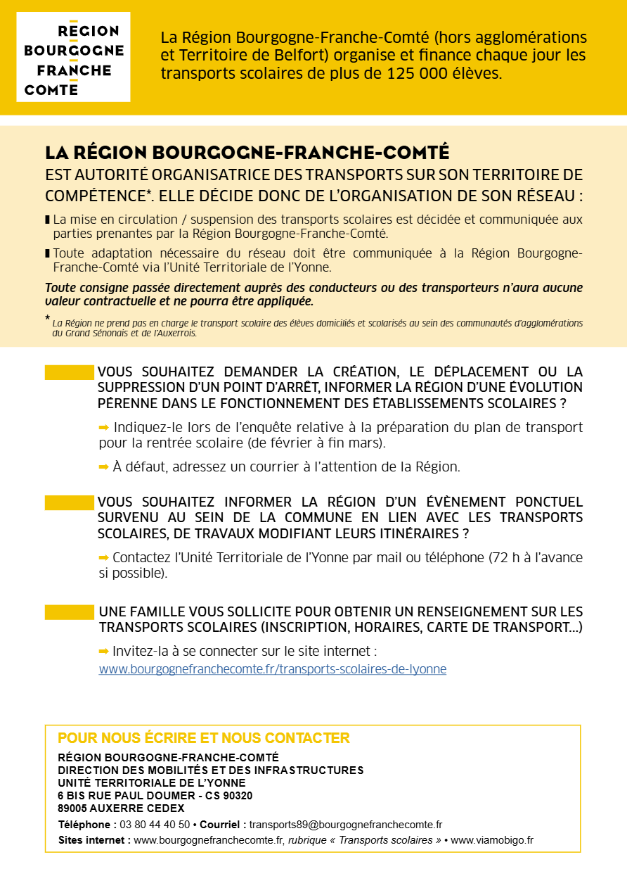L’ensemble des informations relatives à la procédure d’inscription est disponible sur le « Flyer-Mode emploi inscriptions joint ou sur le site internet de la Région : transports scolaires de l'Yonne