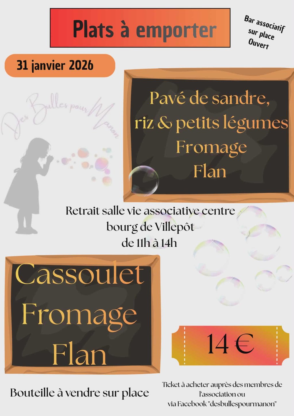 Nous vous proposons une vente de plat à emporter le samedi 31 janvier de 11h à 14h.