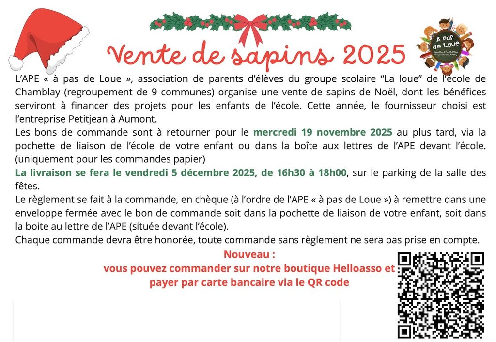 Les bons de commande sont à retourner pour le mercredi 19 novembre 2025 au plus tard, via la pochette de liaison de l’école de votre enfant ou dans la boîte aux lettres de l’APE devant l’école. (Uniquement pour les commandes papier)