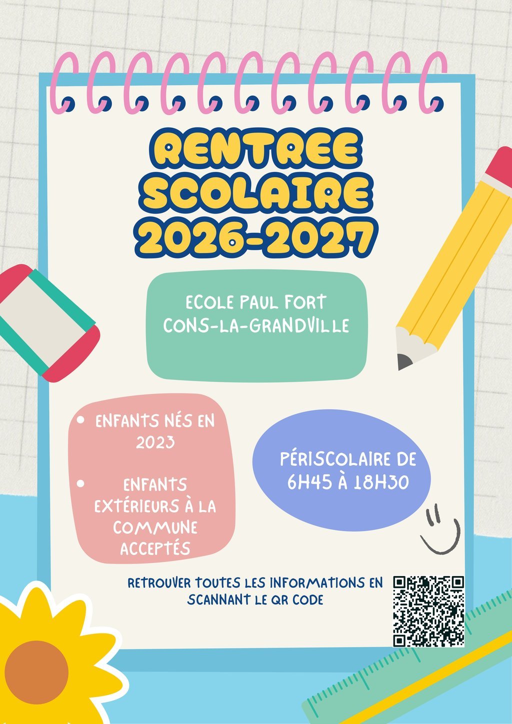Votre enfant est né en 2023, vous pouvez, dès à présent, contacter le syndicat intercommunal scolaire PAUL FORT par mail, pour procéder à son inscription à l'école Paul Fort de Cons la Grandville, pour la rentrée 2026.