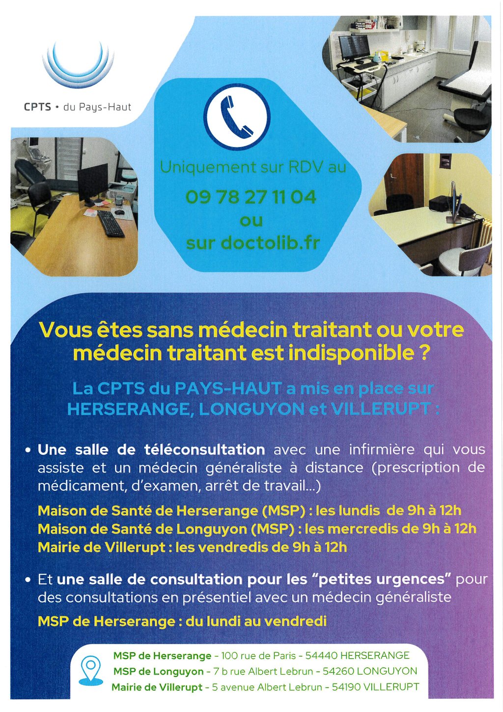 Dans le cadre de l’organisation des soins non programmés et de la téléconsultation portée par la CPTS du Pays-Haut, nous vous informons de deux évolutions importantes :