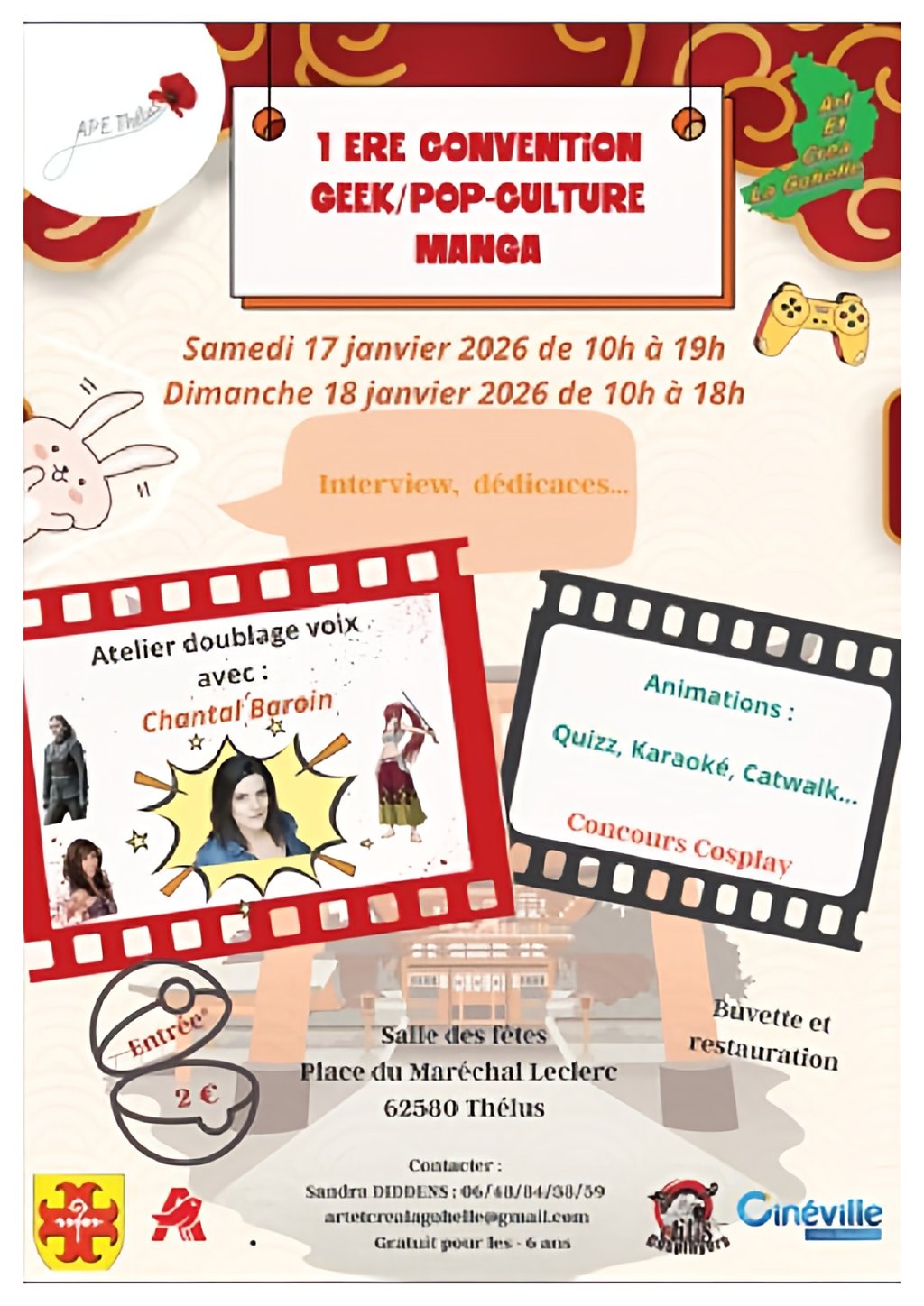 L'association des Parents d'Elèves de l'école des coquelicots, la municipalité et les artisans de la Gohelle vous proposent le 1er salon du manga de Thélus le week-end du 17 et 18 janvier 2026 !