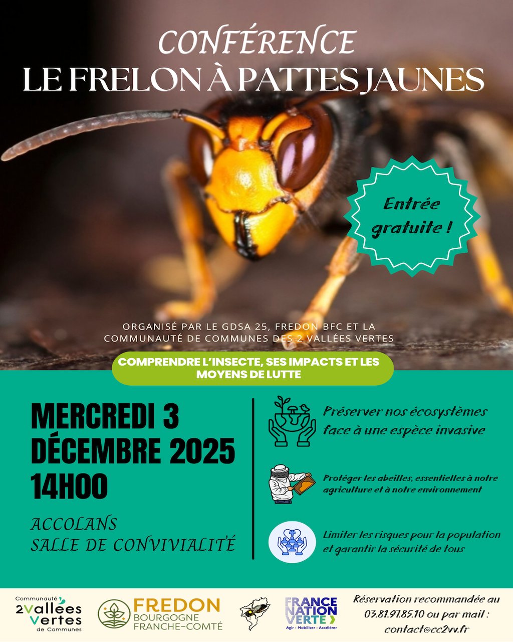 La CC2VV, en partenariat avec FREDON BFC et le GDSA 25, organise une conférence sur le frelon à pattes jaunes le mercredi 3 décembre (14h00) à la salle de convivialité d'Accolans.