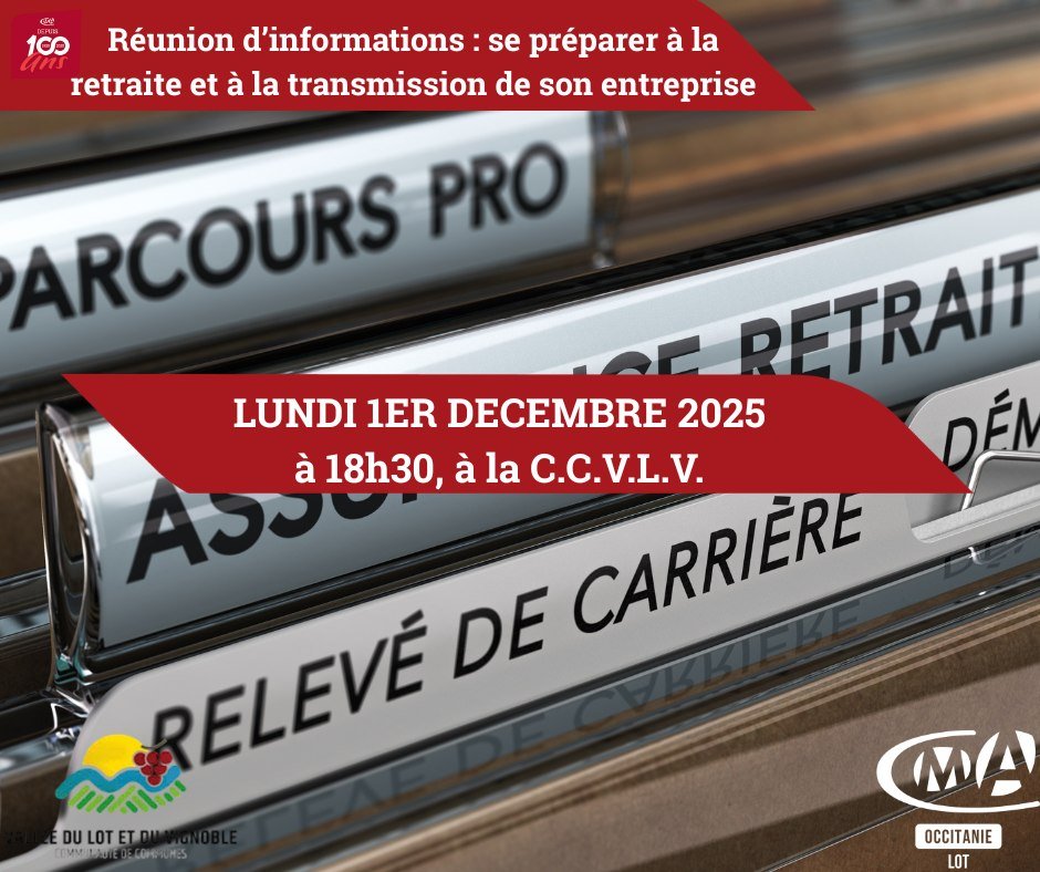 La Chambre de Métiers et de l’Artisanat du Lot, en partenariat avec la Communauté de Communes Vallée du Lot et du Vignoble , vous invite à un moment d’échange afin de répondre à vos questions et vous apporter les éléments pour mieux comprendre la retraite et se préparer à la transmission de son entreprise.