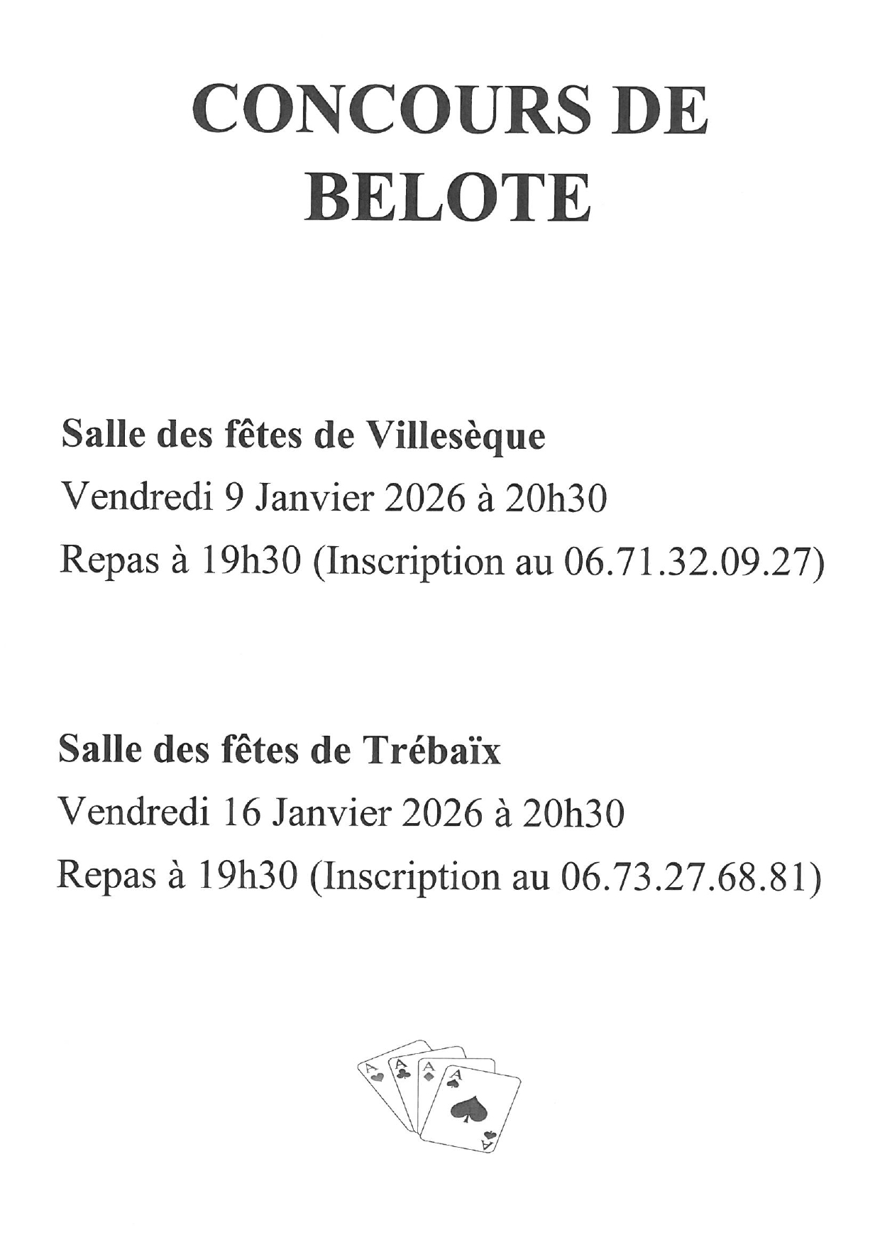 Ci-joint l'affichette concernant les concours de belote qui se dérouleront à Villesèque et Trébaix en janvier 2026