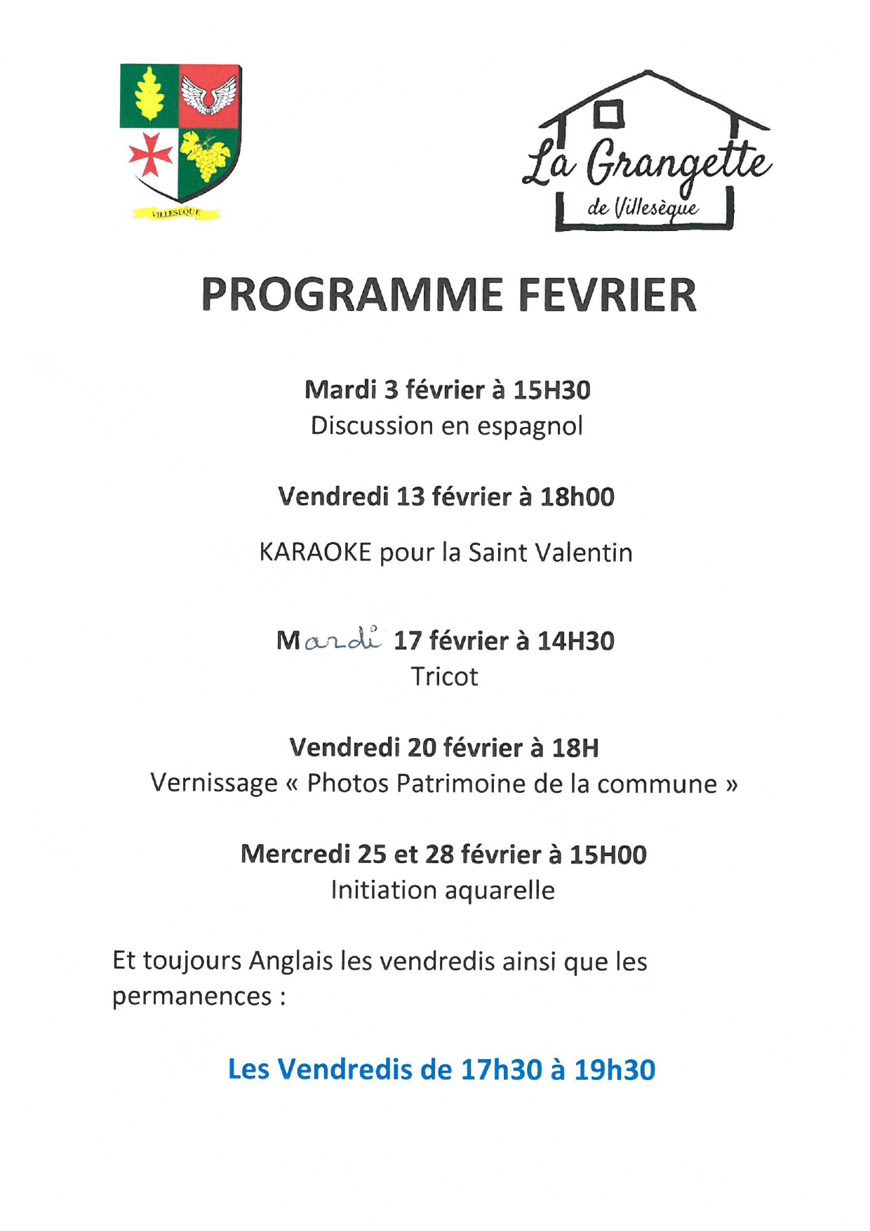 Ci-joint affiche concernant les ateliers à la Grangette pour le mois de février 2026