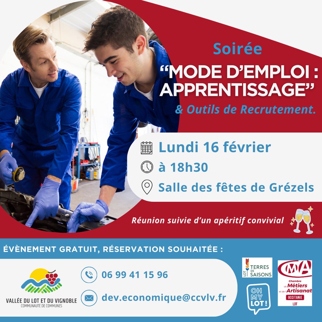 Rendez-vous lundi 16 février à 18h30 à la salle des fêtes de Grézels pour une soirée d’informations sur le thème « Mode d’emploi : Apprentissage » & Outils de Recrutement.