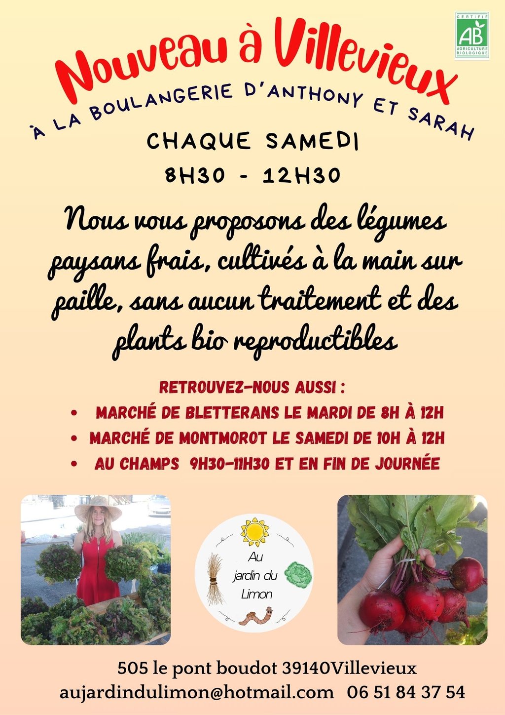 Chaque samedi de 8h30 à 12h30, retrouvez le jardin du Limon à la boulangerie d’Anthony et Sarah à Villevieux !