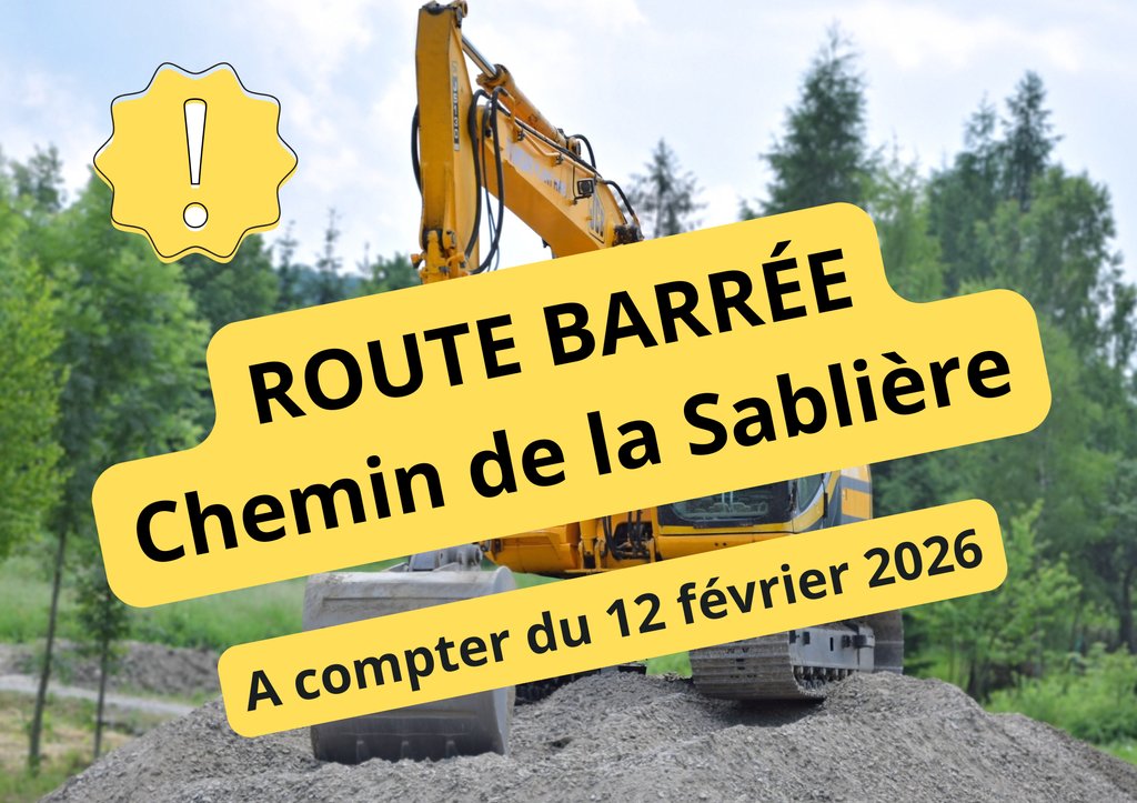 Des perturbations de la circulation sont à prévoir "Chemin de la Sablière" à compter du jeudi 12 février 2026 (pour une durée prévisionnelle de 21 jours).