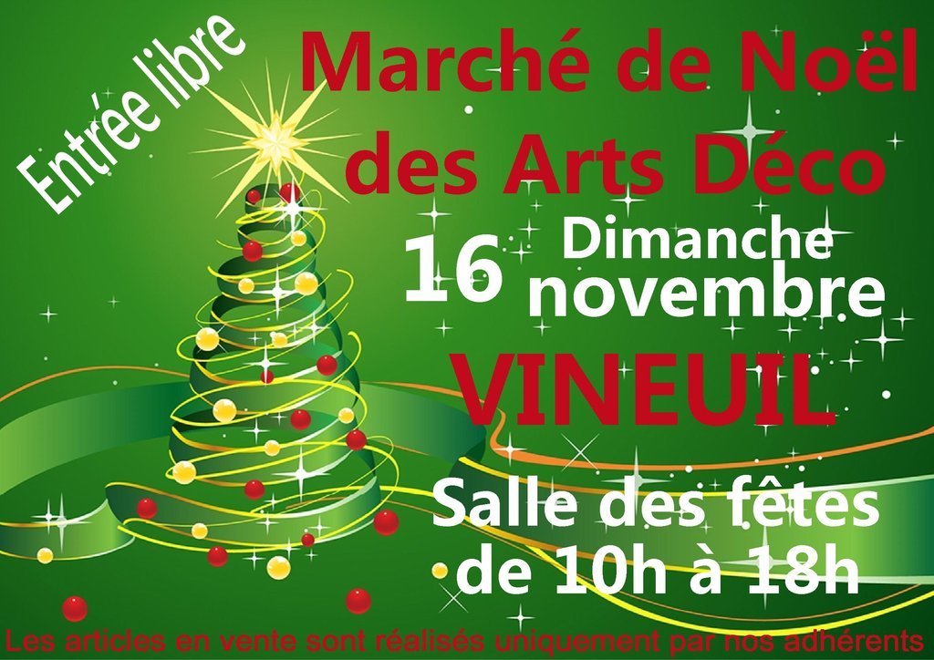 Les Arts Décoratifs de Vineuil organisent leur marché de Noël le dimanche 16 novembre à la salle des fêtes de Vineuil. L'entrée est libre de 10h à18h. Tous les articles exposés sont réalisés par les adhérents de notre association. Une bonne occasion de trouver le cadeau unique pour faire ou se faire plaisir.