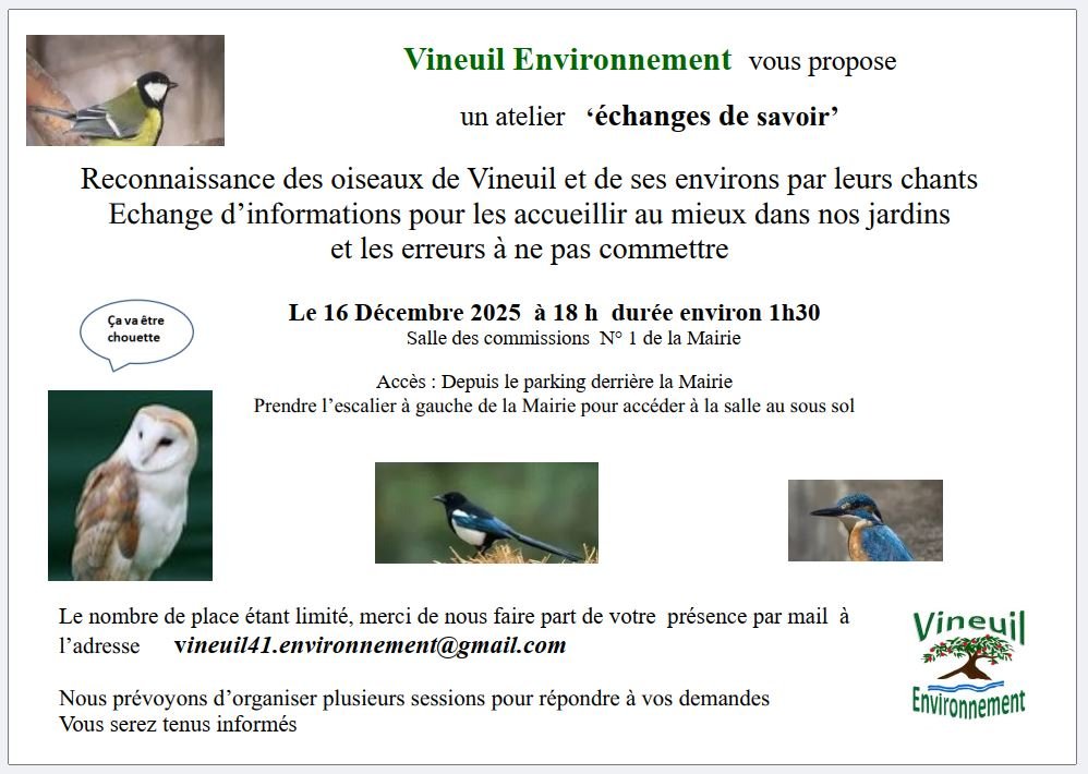 Atelier d'échange : Identification, par leurs chants, des oiseaux présents sur la commune de Vineuil