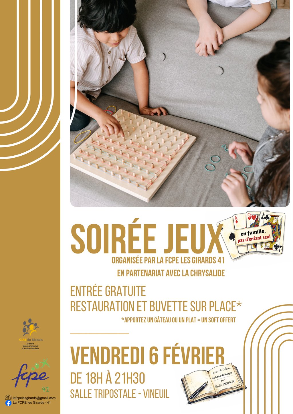 La FCPE les Girards - 41 a le plaisir de vous inviter à une soirée jeux conviviale, en partenariat avec la ludothèque La Chrysalide 🧩