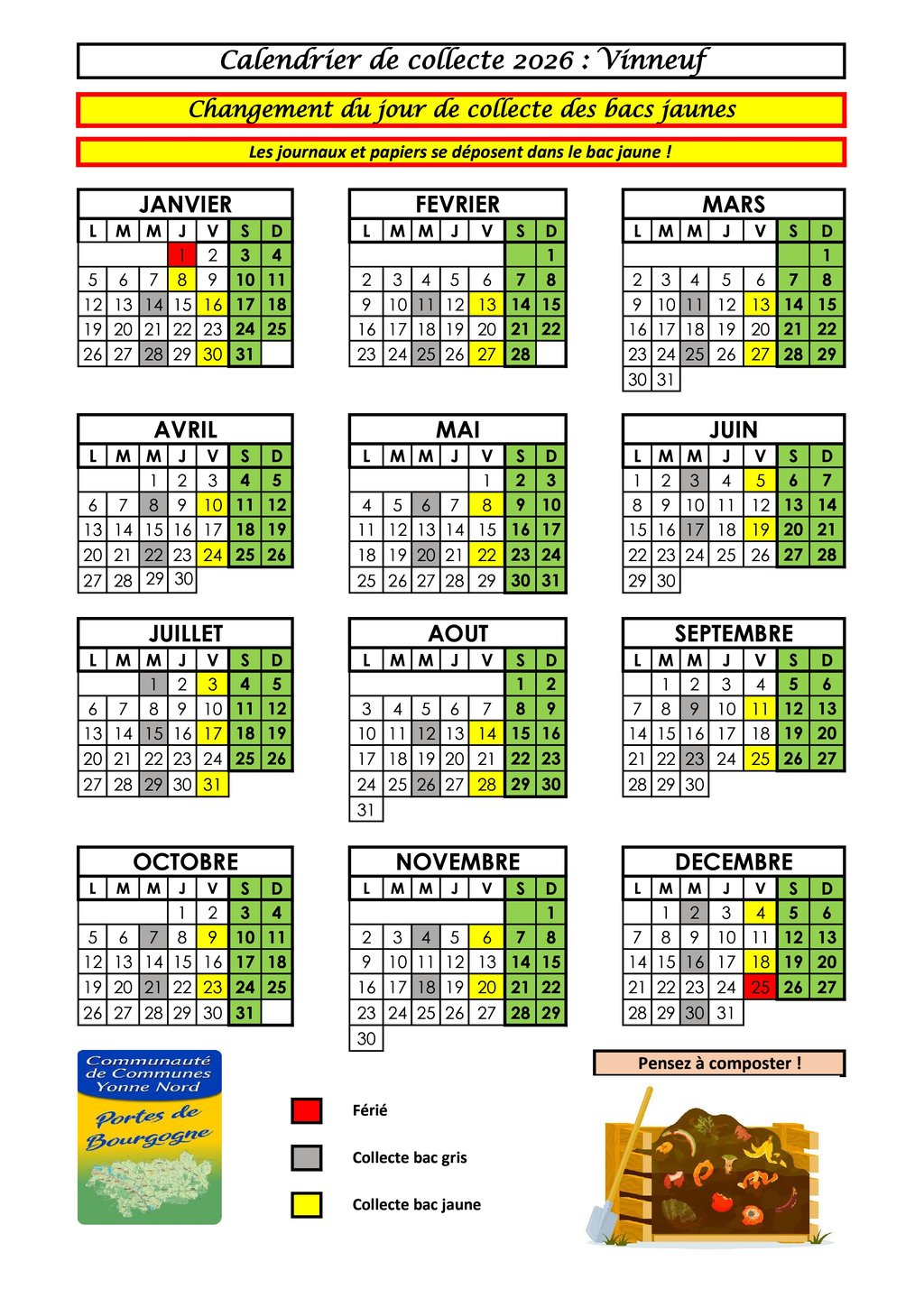 Vinneuf (TRI bac jaune) collecté le Jeudi en semaine PAIRE passera au Vendredi semaine IMPAIRE.