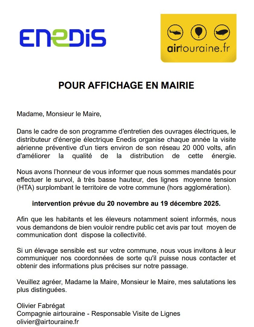 Nous avons l’honneur de vous informer que nous sommes mandatés pour effectuer le survol, à très basse hauteur, des lignes moyenne tension (HTA) surplombant le territoire de votre commune (hors agglomération).