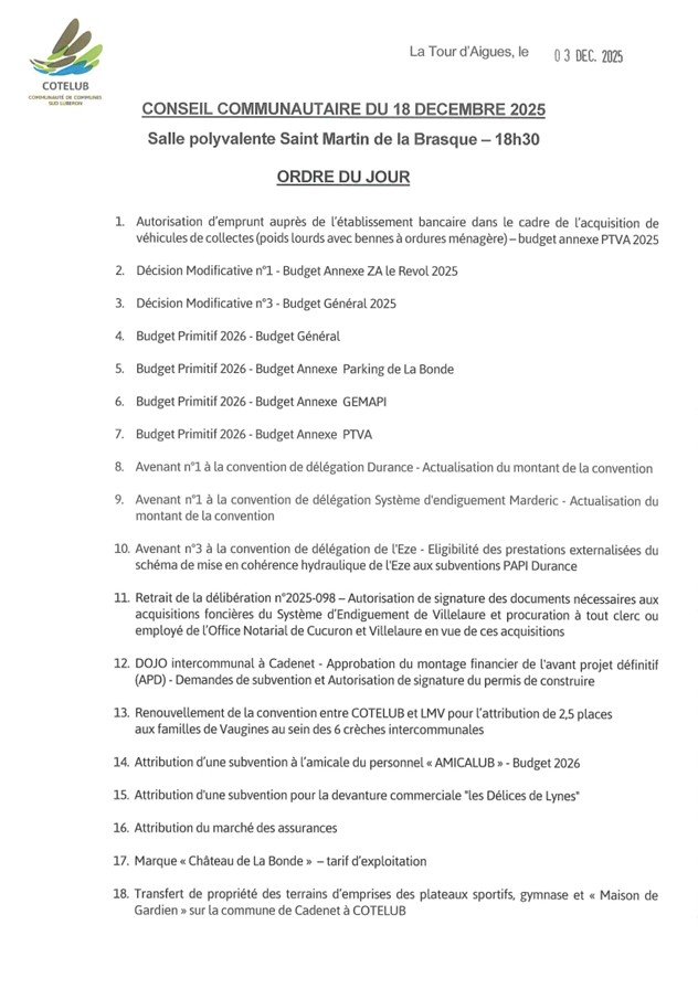 ORDRE DU JOUR DU PROCHAIN CONSEIL COMMUNAUTAIRE