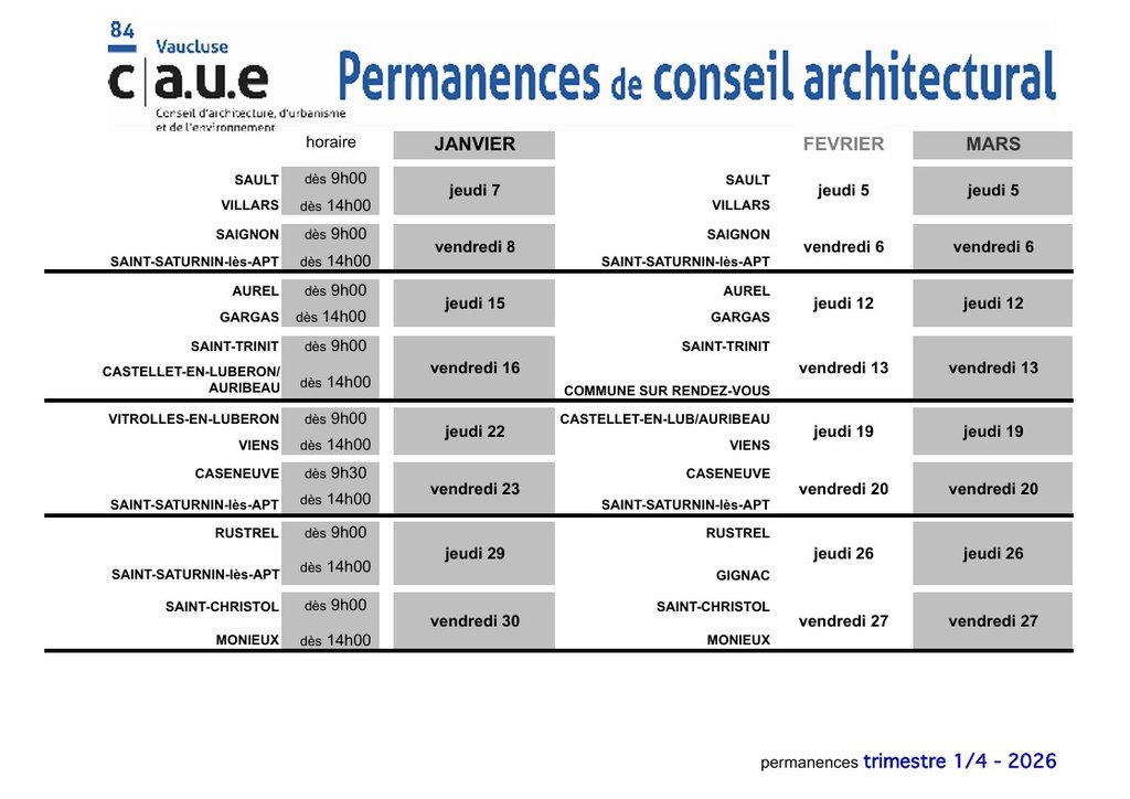 Pour information, voici le planning de l'architecte conseil pour le premier trimestre 2026.