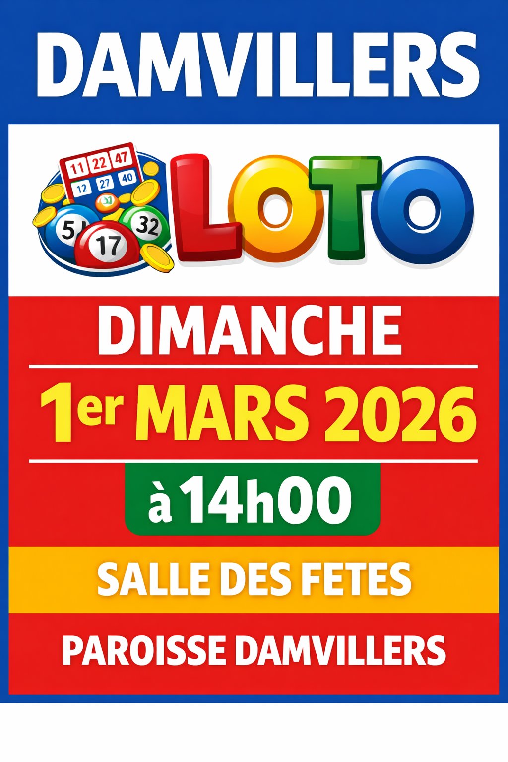 Le LOTO de la Paroisse qui aura lieu le DIMANCHE 1er mars 2026 à la salle des Fêtes de DAMVILLERS