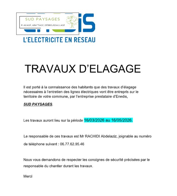 Des travaux d'élagage vont être réalisés sur la commune du 16 mars au 16 mai 2026.
