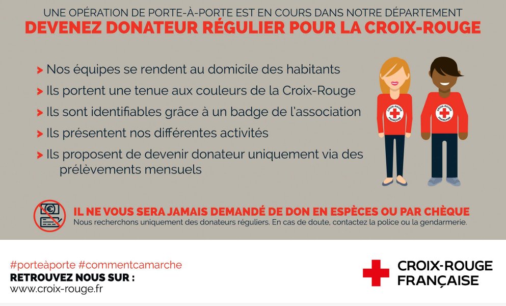 Il s'agit d'un démarchage autorisé. Tous les agents sont équipés d'un badge ainsi que d'une tenue aux couleurs de La Croix Rouge.